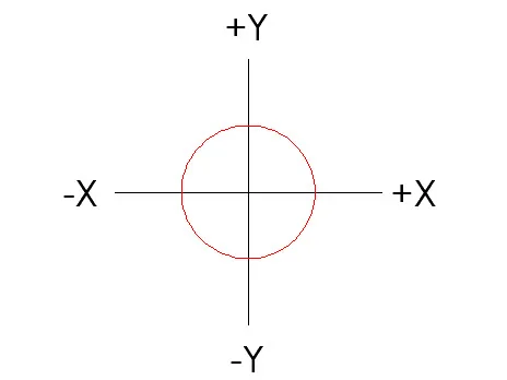 At the intersection of the two axes is coordinate point 0,0. The first 0 represents the position on the x-axis. The second 0 represents the position on the y-axis. The red circle has it center at coordinate point 0,0.
