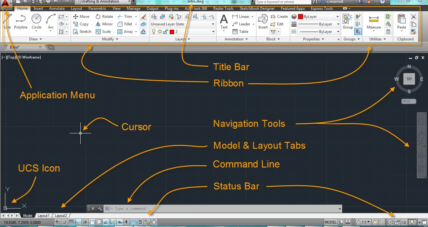 There are numerous components in the AutoCAD workspace. It will be helpful to memorize the terms below and their locations. The terms will be referenced in the course tutorials.