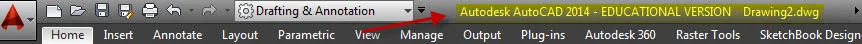 Title Bar: This is where you will find the file name for the current file. The drawing file in the image below is named Drawing2.dwg. Most of the work you will do is in a drawing file. ".dwg" is the file extension for this type of file.