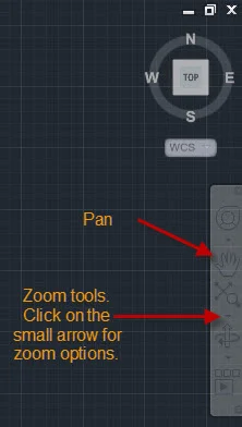 Navigation Tools: These tools can be used to move around the drawing and zoom into areas. For two-dimensional drawing the Pan and Zoom tools are the most useful. You can also hold down the roller on your mouse and drag the cursor across the screen to pan. You can roll the roller on your mouse to zoom in and out.
