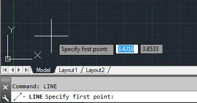 When you enter a command, you will be asked for additional information. In the image below, the first point of a line has been requested. X and Y coordinates could be added or points could be selected with the cursor.