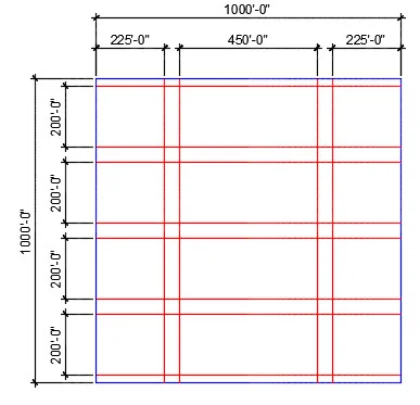 CM.14. Set your current layer to Streets. Using lines draw streets on top of your extrusion in the locations shown below. The streets are 50'-0". The street along the top is cut down its middle and so it is shown as 25'-0" wide. The same is true for the street along the bottom. The streets are red below. The 1000'-0" x 1000'-0" extrusion is blue.
