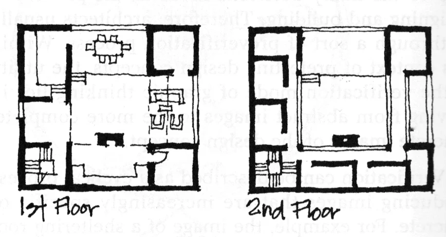 ...which mimics the view that we see with our eyes; plans, elevations and sections have no diminishing lines or vanishing points. Instead everything is flattened. A plan view is a horizontal cut looking down. Cut object, like the walls below are shown with heavy lines. LIght lines indicate objects that are below the cut line. Dashed lines indicate something above.
