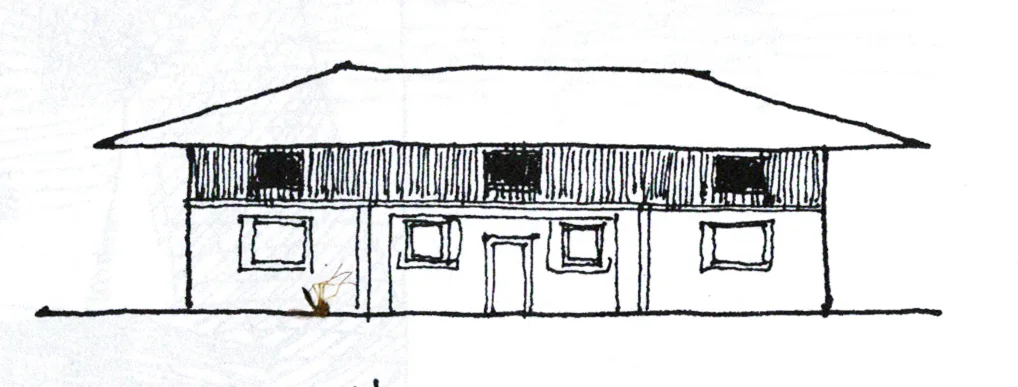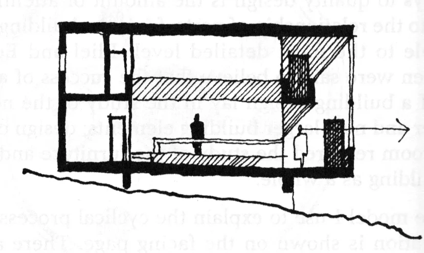 A section is a vertical cut through the building. Again the cut objects are heavy. Objects beyond the cut are shown with light lines. Dashed lines are usually not used. Sometimes tones are used to indicate shadows.